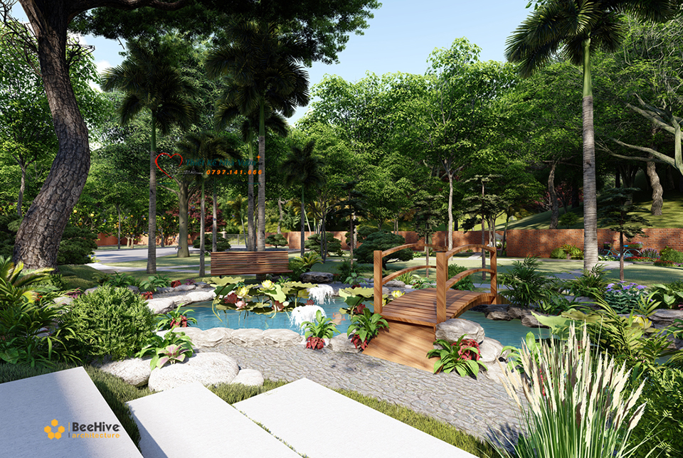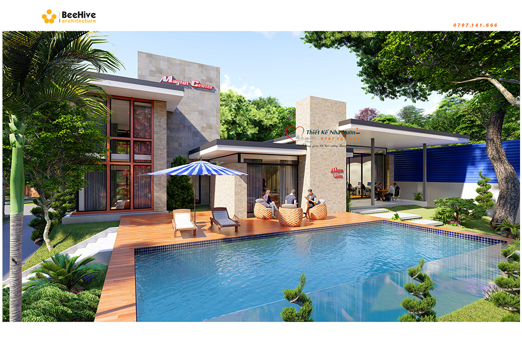 Chào đón mọi người ghé thăm bằng một hồ bơi tươi mát thể hiện cung mệnh của gia chủ, đó là mệnh Kim và mệnh Thổ. Nó mang đến cho gia chủ sự may mắn, tài lộc.