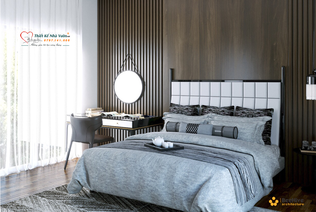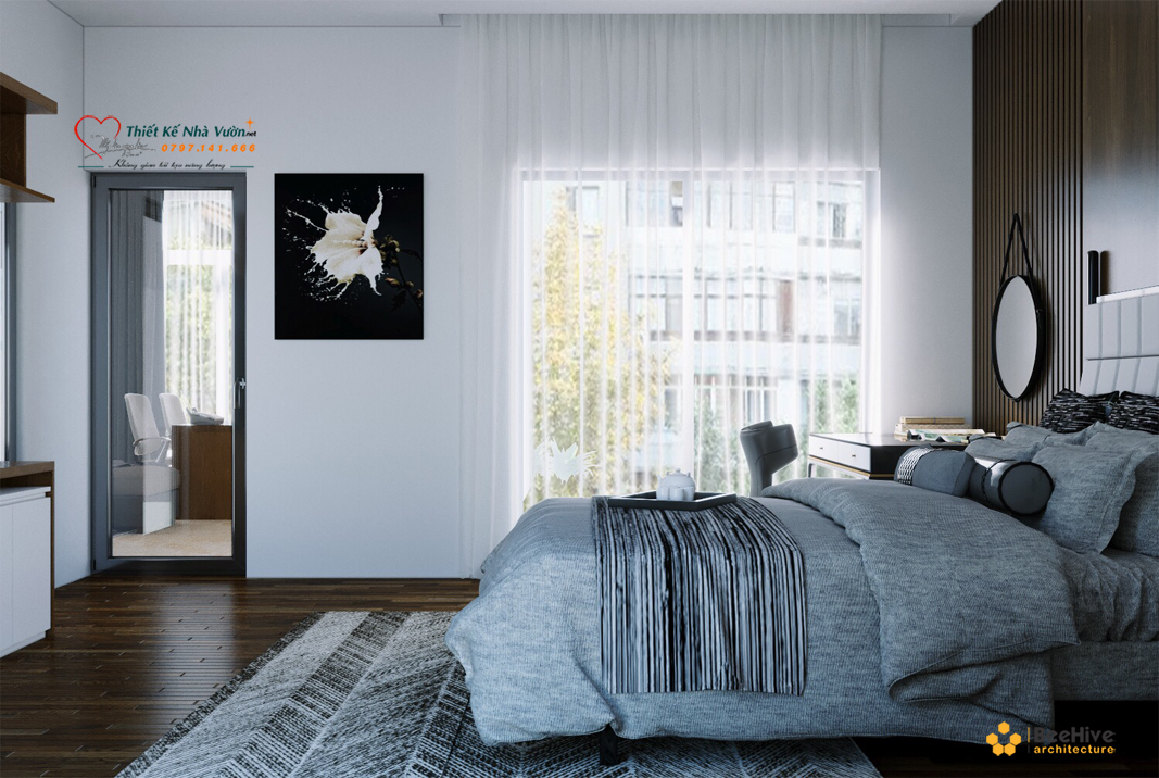 Kế đến là phòng ngủ. Phòng ngủ được thiết kế sang trọng, đầy đủ tiện nghi với gam màu nhẹ nhàng, tạo cảm giác thư giãn, yên tĩnh.